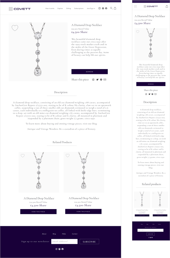 Covett is a fine jewellery company revolutionising the way people can access luxury jewellery via co-ownership and subscription. I worked with London marketing agency Bloom ltd. to help redesign the website and launch their jewellery subscription on social media. Covett’s goal was to highlight the jewellery as much as possible and create a high-end look and feel.